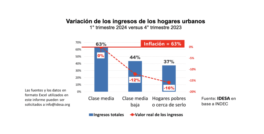 - Los ingresos de los hogares de clase media baja (40% del segmento medio de ingresos) crecieron 44% lo que implica una pérdida real frente a la inflación del -12%.