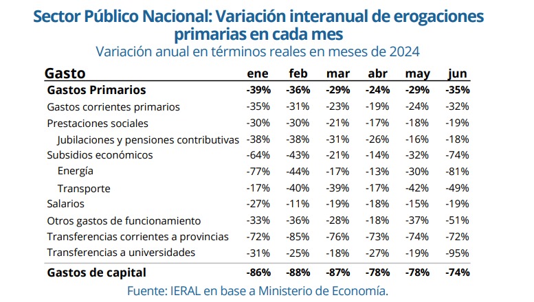 Este ajuste se destacó por estar impulsado exclusivamente por la reducción del gasto público, a diferencia de otras mejoras históricas que dependieron del aumento de los ingresos. La disminución del gasto en 2024 se concentró en transferencias, gasto de capital y personal, consolidando este semestre como un período de fuerte contracción fiscal.