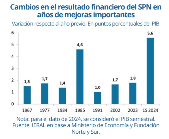 Desde una perspectiva histórica, el ajuste fiscal del primer semestre de 2024 es el más significativo en 64 años, con una mejora del resultado financiero del SPN equivalente a 5,6 puntos del PIB, superando casos anteriores como el Plan Austral de 1985.