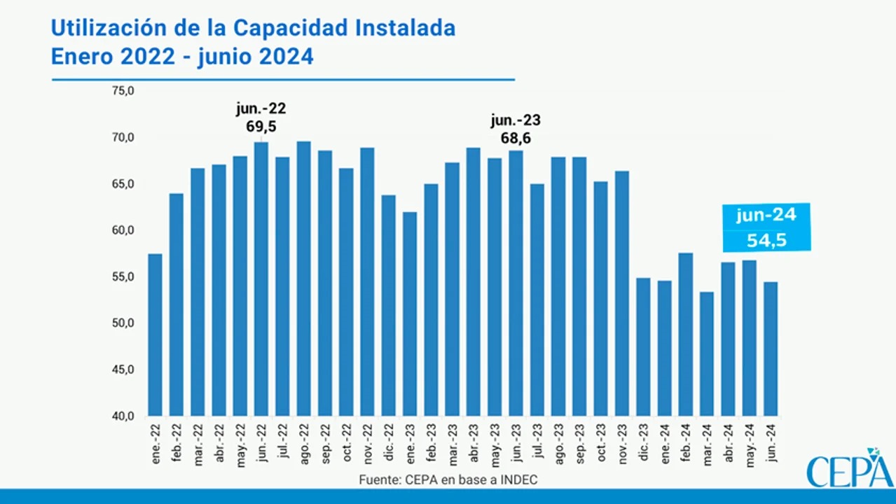 La Utilización de la Capacidad Instalada industrial en junio fue 54,5%: casi idéntico a junio 2020, en plena pandemia (53,3%).