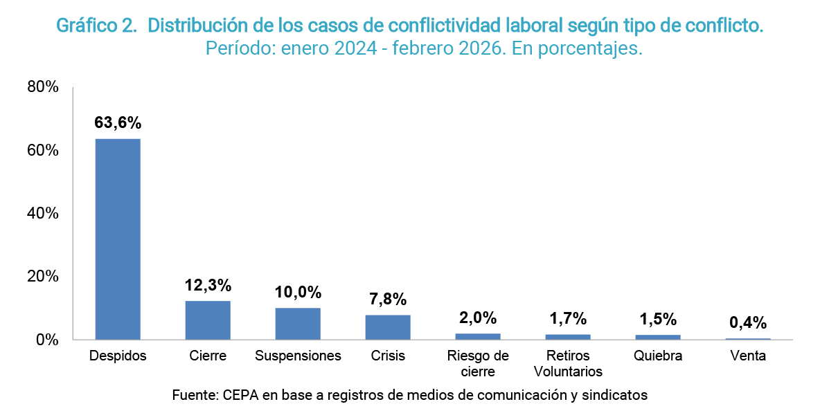 El informe señala que el 63,6% de los conflictos en los primeros dos años de gestión estuvieron motivados por despidos. En segundo lugar se ubicaron los cierres de empresas (12,3%), las suspensiones (10%) y las crisis empresarias (7,8%).