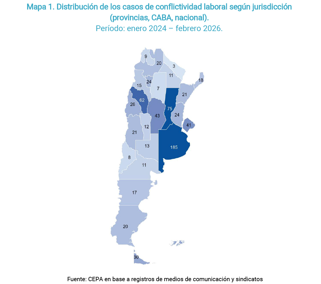 CEPA remarca que, si bien se registraron conflictos en las 24 jurisdicciones del país, “gran parte de la zona centro acaparó casi la mitad de los casos”, reflejando el peso industrial y productivo de esa región.