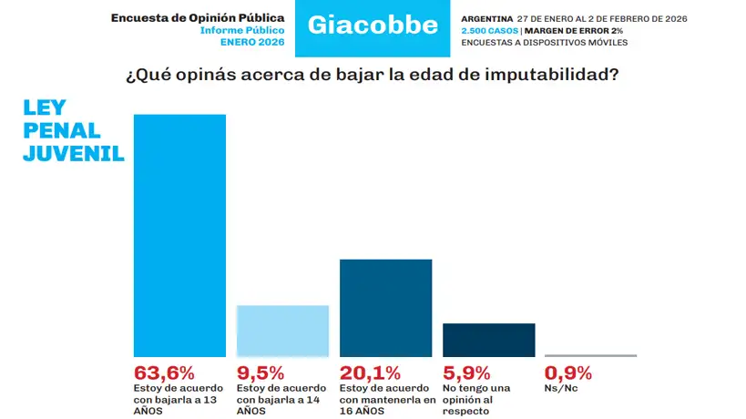 En materia de seguridad, el respaldo social es contundente: el 63,6% está de acuerdo con bajar la edad de imputabilidad a 13 años y un 9,5% a 14 años. Solo el 20,1% sostiene que debe mantenerse en 16 años, mientras que el 5,9% no tiene una opinión formada.