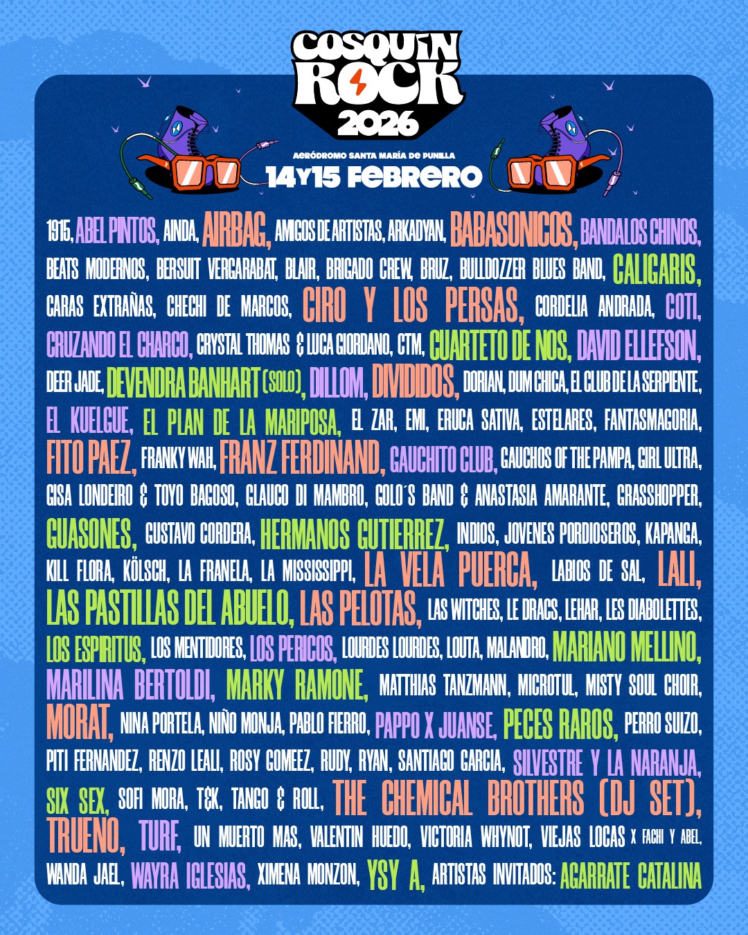 El Cosquín vuelve a ser escenario de los históricos: Divididos, Ciro y Los Persas, Babasónicos, Las Pelotas, Las Pastillas del Abuelo, Los Caligaris, La Vela Puerca y el esperado regreso de Viejas Locas x Fachi y Abel, que encenderán la nostalgia de miles de fans.