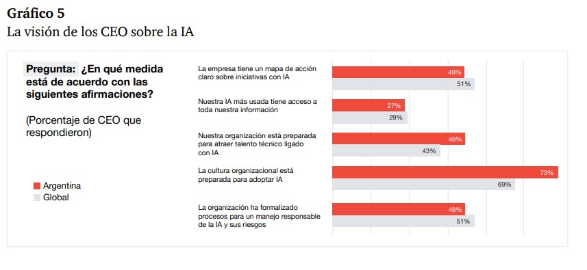 Uno de los capítulos más sensibles del informe es el impacto de la IA en el mercado laboral. El 65% de los CEO argentinos anticipa una reducción del empleo en puestos junior, analistas y staff en los próximos tres años, mientras que los niveles gerenciales y ejecutivos se mantendrían relativamente estables.