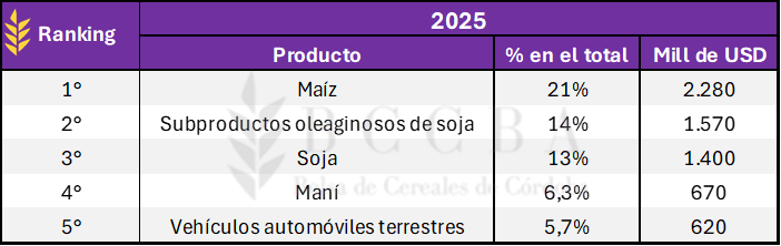 Entre los productos individuales más relevantes se destacaron la harina de soja (US$ 8.560 millones), el aceite de soja (US$ 7.140 millones) y el maíz en grano (US$ 6.515 millones).