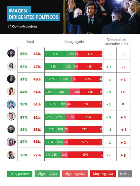 Por otro lado, la calificación regular de Milei se ubica en 4%, lo que indica un nivel inicial de descontento. En tanto, la consultora Opina arroja resultados más favorables: 53% de positiva contra 46% de negativa, un saldo de 7 pp, estadísticamente relevante dado el error de +/-1,85%.
