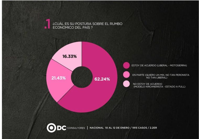 Uno de los datos centrales del informe tiene que ver con la percepción sobre el rumbo económico. El 62,24% de los encuestados considera correcto el camino de la ‘motosierra’ y la reducción de la injerencia del Estado, mientras que un 21,43% acuerda de manera parcial. En contraste, solo el 16,33% se manifiesta en desacuerdo y expresa preferencia por un modelo similar al kirchnerista.