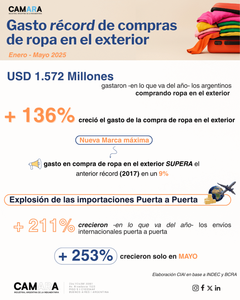 Este panorama se agrava por un dato contundente: el gasto de los argentinos en la compra de ropa en el exterior alcanzó un nivel récord en los primeros cinco meses del año. Entre enero y mayo de 2025, se desembolsaron US$ 1.572 millones en indumentaria adquirida fuera del país, lo que representa un crecimiento interanual del 136% y supera en un 9% el récord anterior, registrado en 2017. Así, se establece una nueva marca histórica en términos de compras externas de vestimenta.