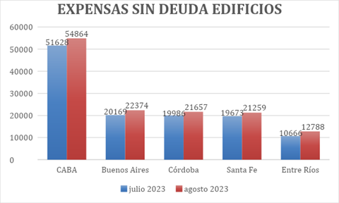 En la Provincia de Buenos Aires, la expensa promedio en edificios sin incluir deuda correspondiente a agosto es de $22.374. En julio fue de $20.169 por lo que el incremento es del 10,93%. Si se compara la expensa de agosto de este año con la de agosto del 2022 de $9.923, el incremento interanual es del 125,47%.