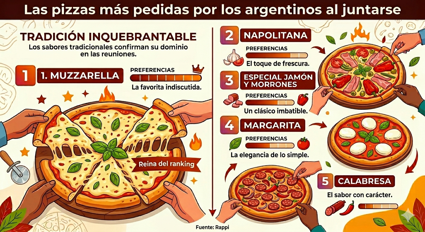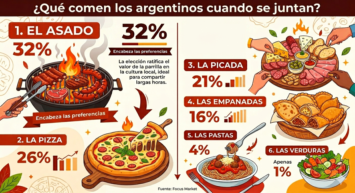 Cuando el encuentro se traslada a la casa, los consumidores optan por platos que garanticen rendimiento y facilidad para compartir. Según datos de Focus Market, el ranking de preferencias lo encabezan:
