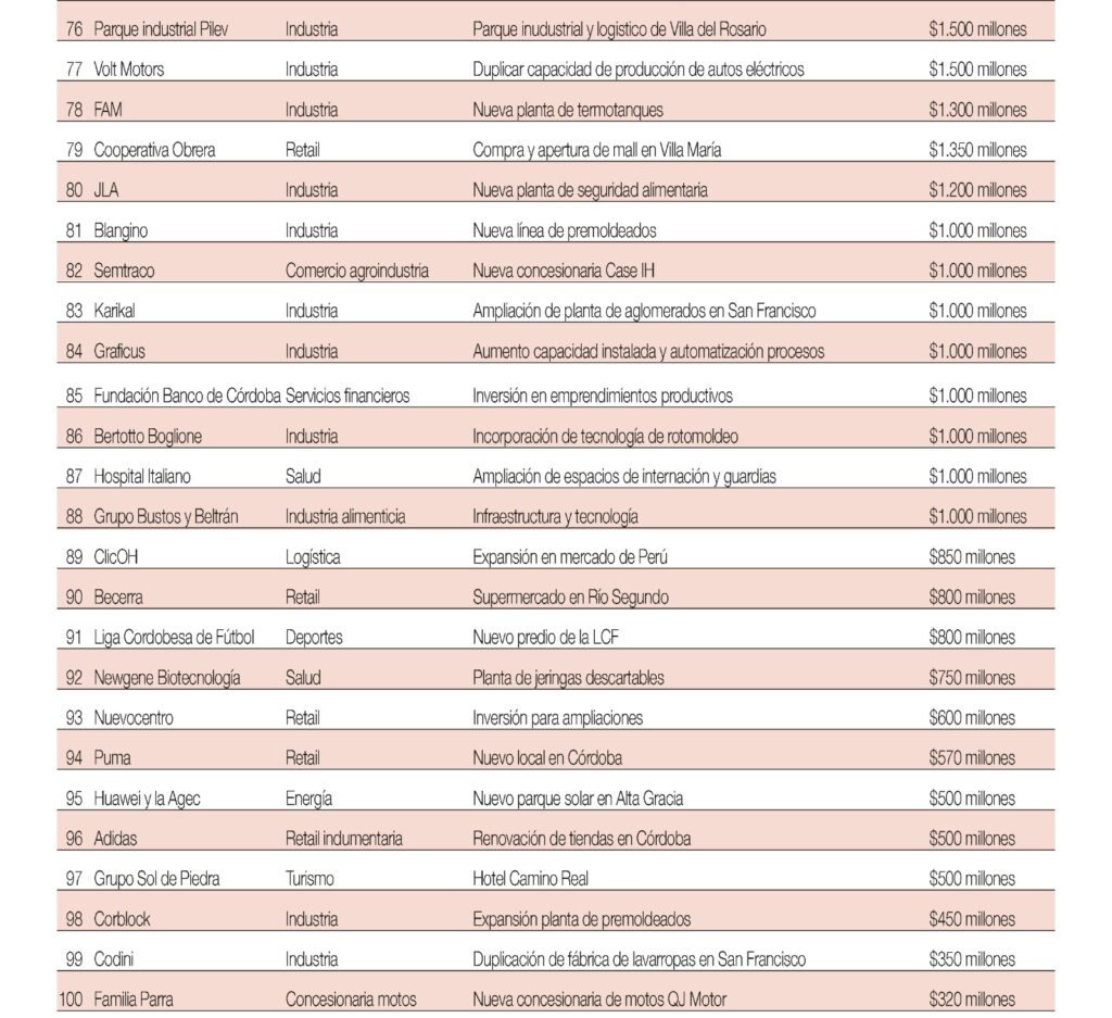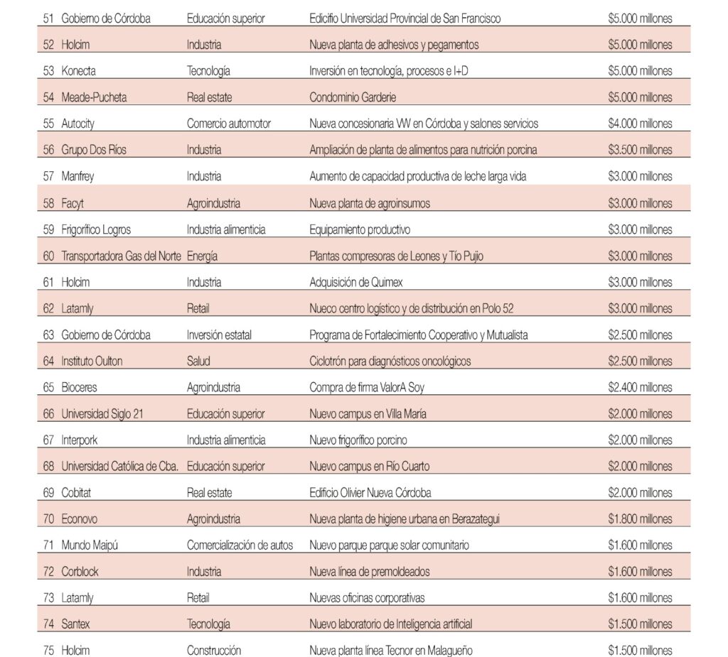 Así se propone un ranking de inversiones productivas privadas, salvo contadas excepciones de origen estatal que se justifican por el acompañamiento que realizan en términos de aporte a la infraestructura.
