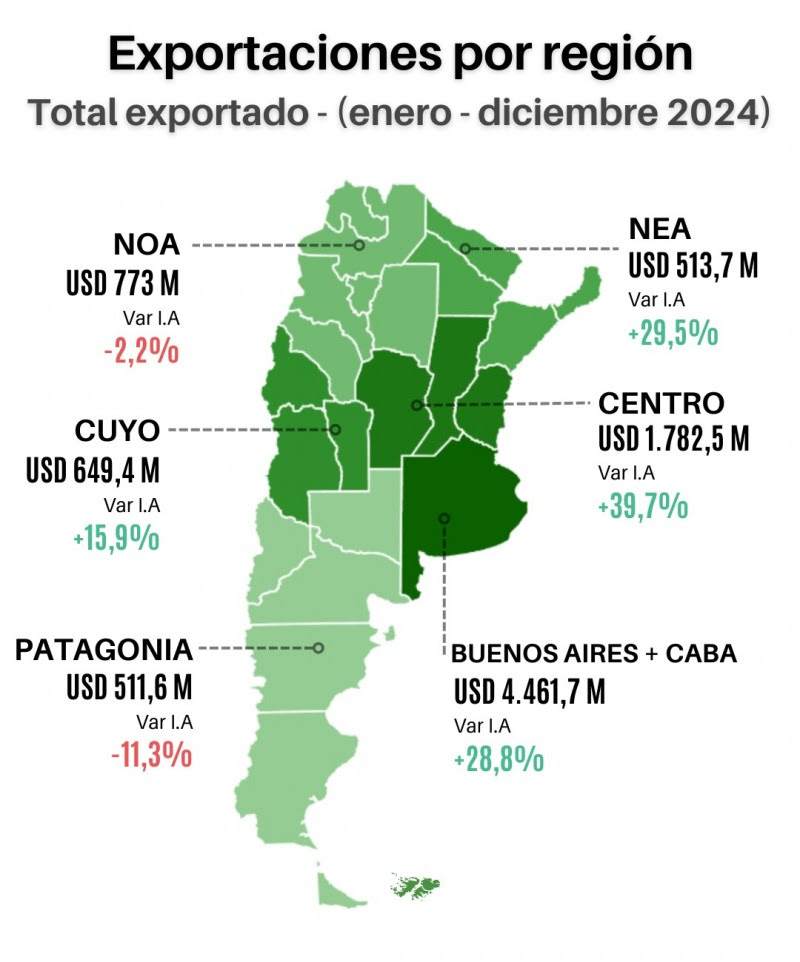 Las exportaciones de las economías regionales argentinas experimentaron un importante crecimiento en 2024, con un aumento del 23,8% en dólares y 25,7% en toneladas, según el Monitor de Exportaciones de las Economías Regionales (MEER) de la Confederación Argentina de la Mediana Empresa (CAME). En este contexto, la región Centro, integrada por Córdoba, Santa Fe y Entre Ríos, se consolidó como la segunda más relevante del país, representando el 20,4% de las exportaciones nacionales y acumulando ventas por US$ 1.782,5 millones.