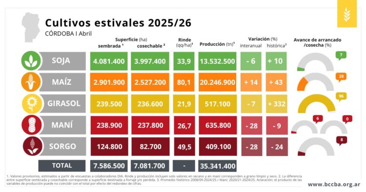 Un informe de la Bolsa de Cereales de Córdoba remarca que, por el contrario, el panorama es más ajustado para el maní y el sorgo: aunque sus rendimientos no se alejan demasiado de lo habitual, las producciones esperadas para ambos cultivos se perfilan como las más bajas desde la campaña 2022/23, ciclo que estuvo marcado por una severa sequía.