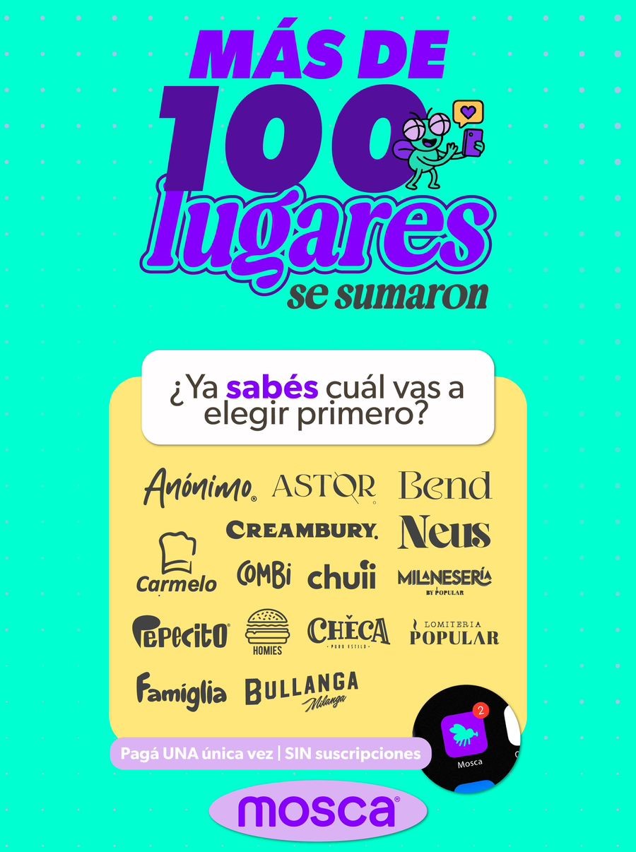 Mosca propone un sistema simple: el usuario compra una Mosca Wallet, una cuponera 100% digital que permite acceder a beneficios 2×1 en restaurantes, cafeterías, heladerías y bodegones de Córdoba y alrededores (entre algunas marcas se destaca Homies, Pizzería Popular, Parrilla La Emilia, IDA Restaurante, Astor, Famiglia y más), desde el 1 de julio hasta el 31 de diciembre. La Wallet se adquiere a un precio promocional (actualmente en preventa) y tiene un valor general de $48.000.