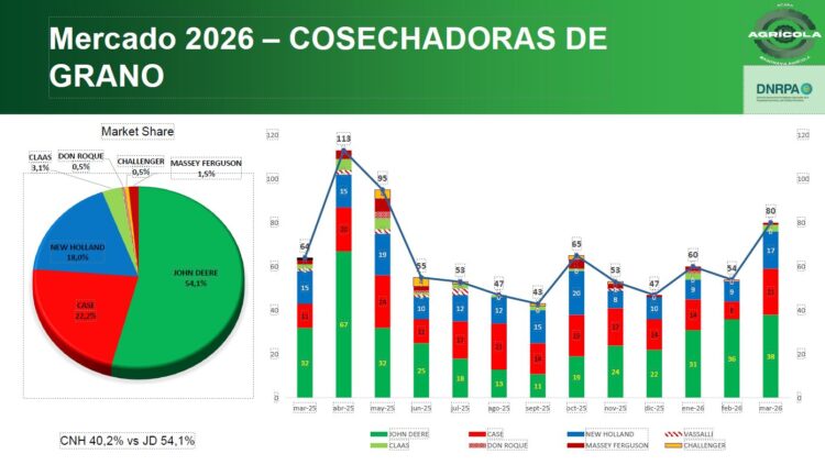 En términos de participación de mercado, John Deere mantiene el liderazgo con el 37,6%, seguido por New Holland (15,1%) y Case (14,8%). Si se agrupan marcas, el bloque CNH alcanza el 29,9%, mientras que AGCO representa el 11,7%.