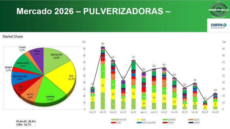 A contramano del resto, el segmento de pulverizadoras sigue mostrando señales de debilidad estructural. Si bien en marzo se patentaron 24 unidades —el doble que en febrero—, la comparación interanual arroja una caída del 27,3%.