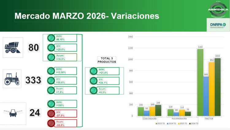 En el acumulado del año, los tractores alcanzan 1.022 unidades, lo que implica un crecimiento del 7,5% frente al primer trimestre de 2025.