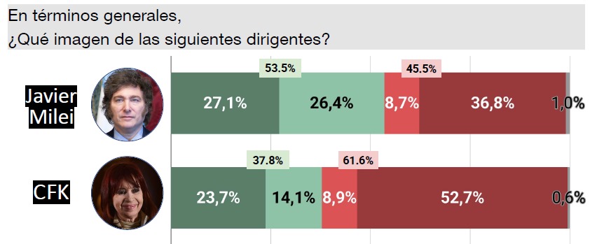 Otro dato relevante del informe es la imagen de los principales referentes políticos. Cristina Fernández de Kirchner cosecha una imagen negativa del 53,5%, frente a un 45,5% positiva. Javier Milei, en cambio, registra una imagen levemente más equilibrada con 58,9% de negativa y 37,1% positiva. Axel Kicillof, actual gobernador bonaerense, tiene una imagen negativa del 61,6% y positiva del 37,8%.