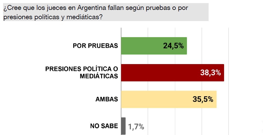 En cuanto a la confianza en el Poder Judicial, los resultados reflejan un clima de escepticismo: la mayoría de los encuestados cree que los jueces fallan más por presiones políticas y mediáticas que en base a pruebas objetivas. Además, una amplia mayoría considera que otros expresidentes y funcionarios actuales no son investigados con la misma intensidad que CFK.