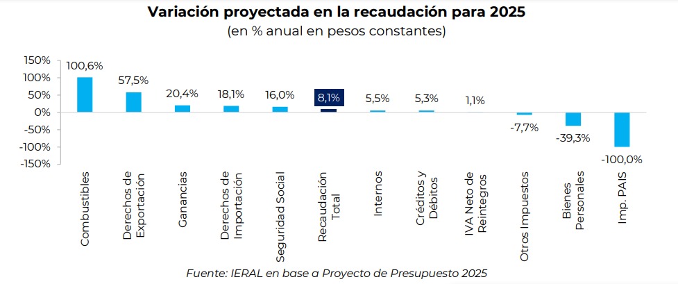 El presupuesto proyecta un incremento en la recaudación del 8.1% por encima de la inflación, impulsado principalmente por aumentos en impuestos como los combustibles (+100.6%), derechos de exportación (+57.5%), y ganancias (+20.4%). Sin embargo, la Fundación Mediterránea advierte que estas estimaciones podrían ser optimistas, especialmente en lo que respecta a los derechos de exportación. Un factor clave será el comportamiento de la inflación. Si esta supera el 18.3% estimado y se acerca al 35% anual proyectado por el Relevamiento de Expectativas de Mercado (REM), la recaudación podría aumentar un 17% más de lo presupuestado nominalmente.