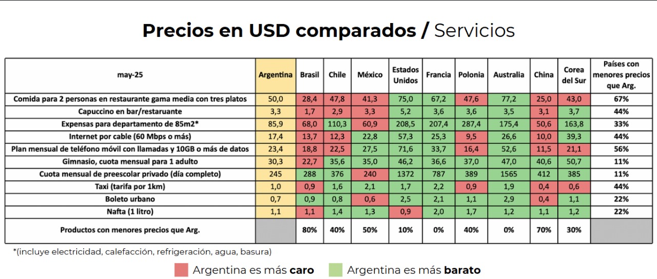 Servicios personales y familiares: Argentina muestra precios más altos en un 36% de los servicios relevados. Destaca por ser más costosa que Brasil en el 80% de los casos, pero aún conserva cierta competitividad frente a países desarrollados. Servicios como telefonía móvil o una comida en restaurante resultan más caros localmente, pero otros como el boleto urbano, la cuota del gimnasio o el preescolar, se mantienen entre los más baratos, gracias en parte a subsidios estatales.