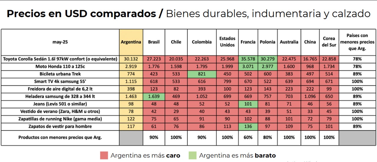 Por otra parte, al ampliar la comparación con 100 países, usando la base de datos internacional Numbeo, los productos argentinos más caros del ranking pertenecen al rubro textil: un vestido de verano ocupa el 2° lugar mundial, seguido por zapatillas deportivas (3°) y jeans (11°). En contraste, productos como el vino, la carne vacuna o la cuota del gimnasio aparecen entre los más baratos a nivel global.